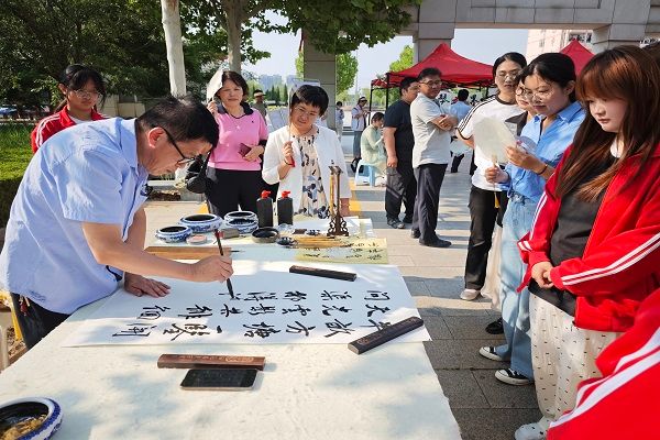 活动以“沉浸式温暖体验”为主线,分三大环节层层展开:首先是‘100件幸福小事’签到墙环节,师生用彩笔在幸福泡泡里面写下生活碎片——“图书馆抢到靠窗座位”“傍晚遇见的粉紫色晚霞”等,瞬间构筑起校园“正能量磁场”,不少人拍照分享时笑称“原来幸福藏在这么多小事里”。现场书画文创体验,团扇、牛皮纸袋、圆木片等素材摆满长桌,师生挥毫泼墨间创意迸发:有人在团扇上题“松弛感”三字自嘲“当代青年生存哲学”,有人用金粉在纸袋绘下教学楼剪影作毕业纪念,成品既可带走收藏。压轴的情绪编织工坊则弥漫着静谧氛围,在古琴曲《流水》背景中,参与者手握彩铅跟随主持人引导“将焦虑揉进深灰,把期待染成明黄”,自由涂抹的画布逐渐化作内心映射。完成后,用手中的纸条编织出属于自己的心灵之作。