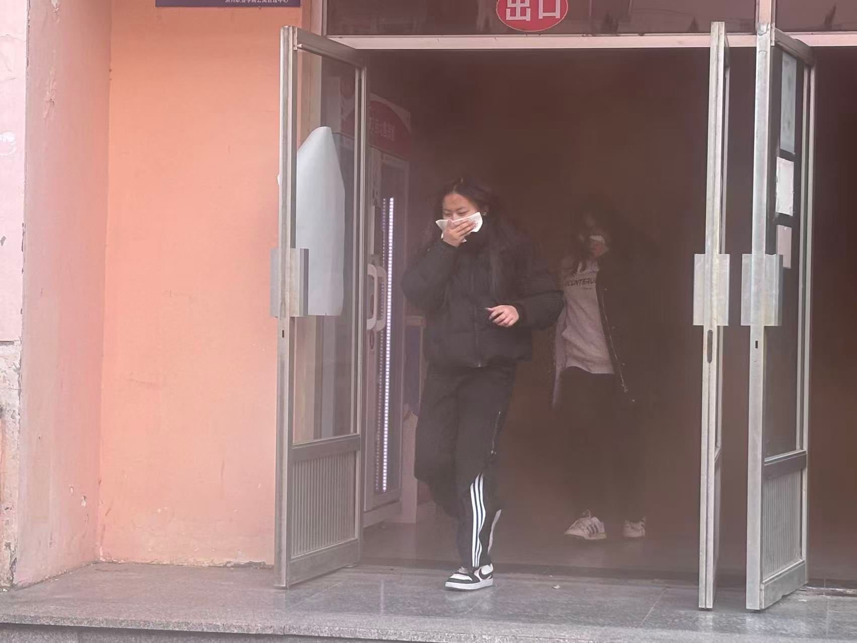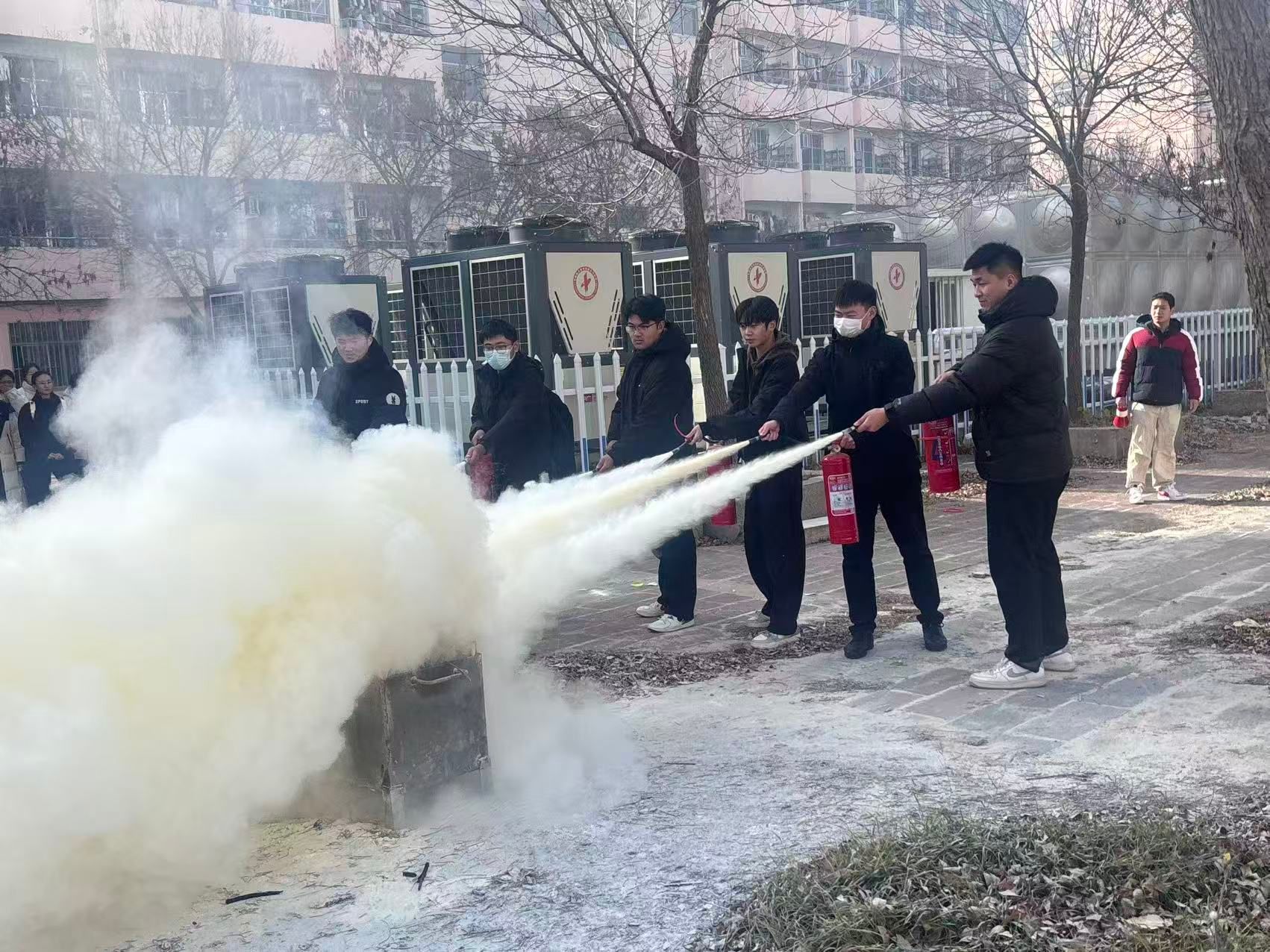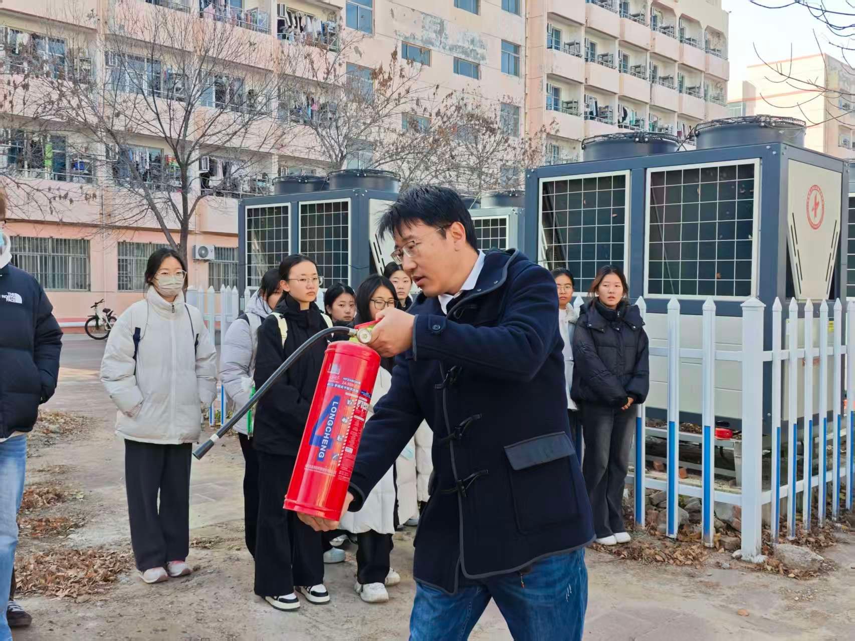 10时许,七号楼公寓楼前集合区域内,全体人员整齐列队。保卫处工作人员结合宿舍消防痛点展开讲解,针对电器线路老化、违规抽烟等常见隐患,细致剖析潜在危害与排查方法。10时20分,演练总指挥一声令下,公寓楼道内烟雾弹释放,浓烟迅速弥漫,警报声同步响起。公寓管理员即刻启动应急响应,引导学生冷静应对:携带备用防毒面罩的学生规范佩戴,未携带的则用毛巾捂鼻,全体人员弯腰低姿沿预定安全线路有序疏散。辅导员提前在疏散楼梯口、楼栋出口值守,实时疏导人流、提醒安全间距,有效规避拥挤踩踏风险。最终,全体学生均按时撤离至指定区域,各班级迅速清点人数并向总指挥汇报,全过程紧张有序、规范高效。随后,保卫处工作人员现场示范灭火器“提、拔、握、压”操作步骤,讲解不同火情适配的灭火器材及安全扑救距离,指导学生分组实操,纠正握姿、喷射角度等细节问题,确保人人掌握初期灭火技能。